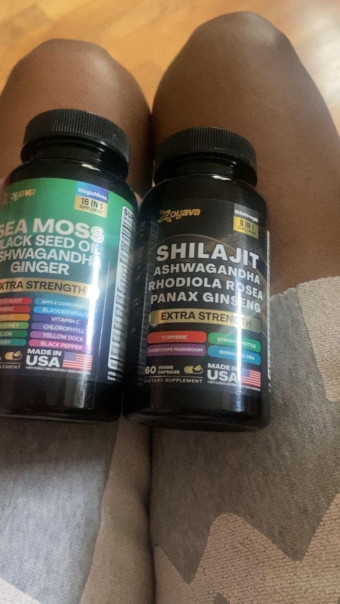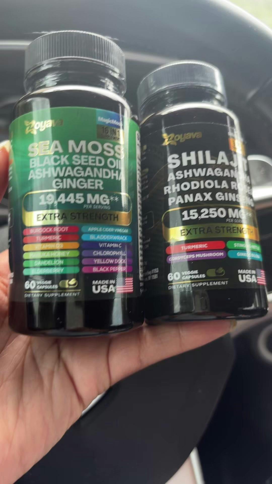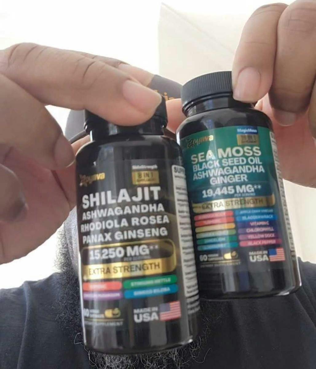 You’ll receive 1 bottle (60 capsules) of Sea Moss Multivitamin and 1 bottle (60 capsules) of Shilajit Power Capsules—120 capsules total.