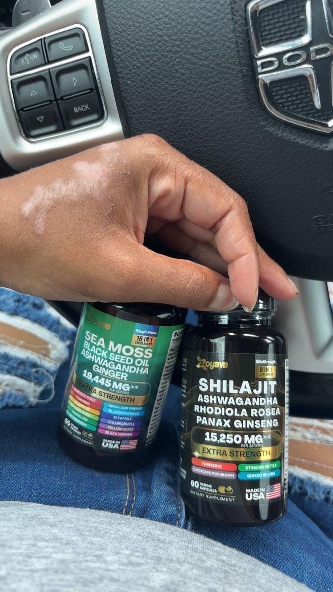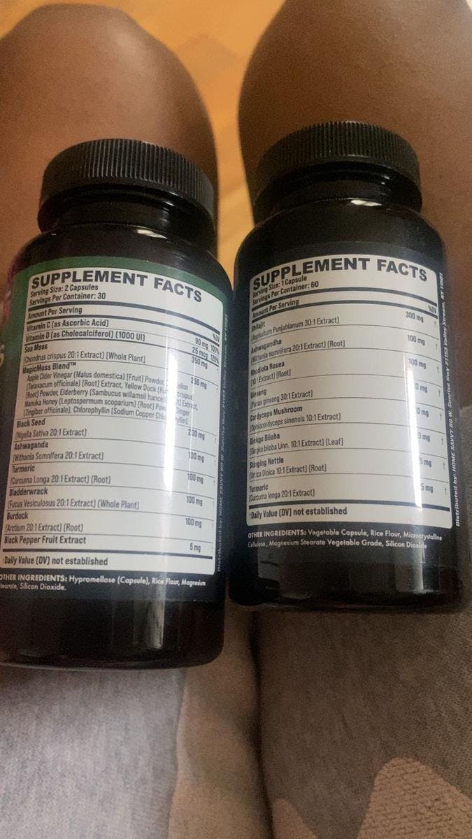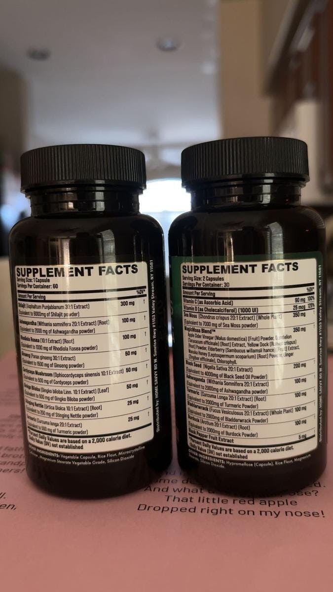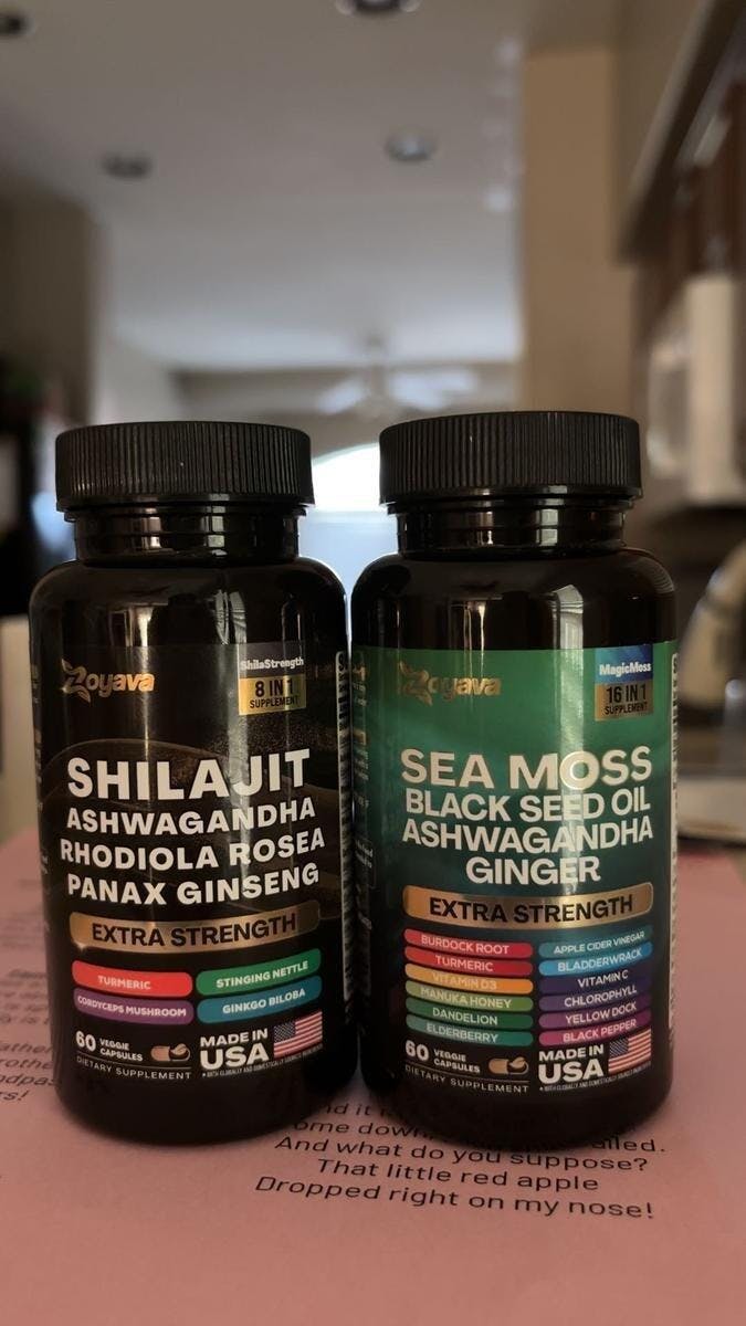 You’ll receive 1 bottle (60 capsules) of Sea Moss Multivitamin and 1 bottle (60 capsules) of Shilajit Power Capsules—120 capsules total.